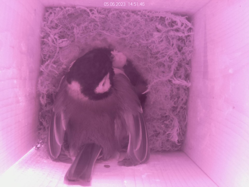 Und kurz darauf sind nur noch drei drin, Elternmeise hat das eine rausgetragen
