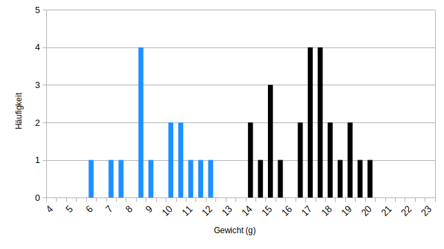Blau = Blaumeisen, Schwarz = Kohlmeisen. Das Gewicht wurde auf halbe Gramm gerundet und die Häufigkeit für jeden Wert gezählt.