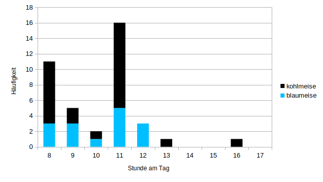 Blau = Blaumeisen, Schwarz = Kohlmeisen. Dargestellt ist die Anzahl der Besuche pro Stunde.