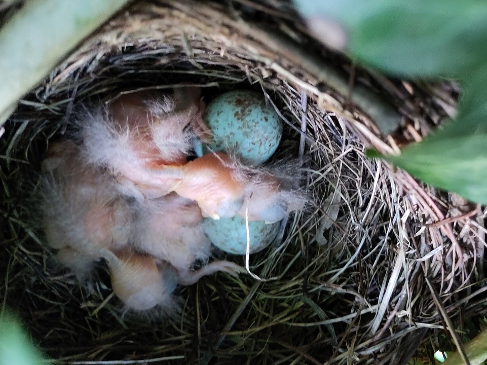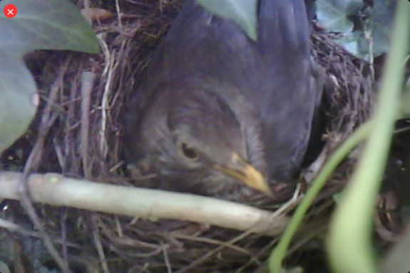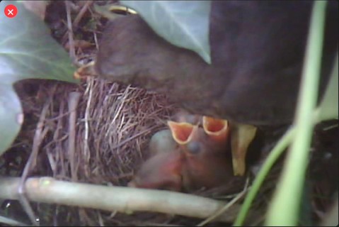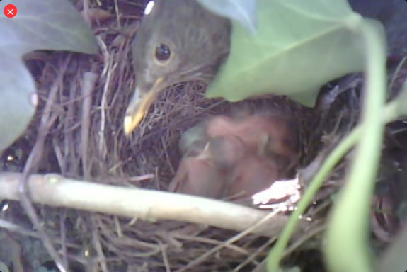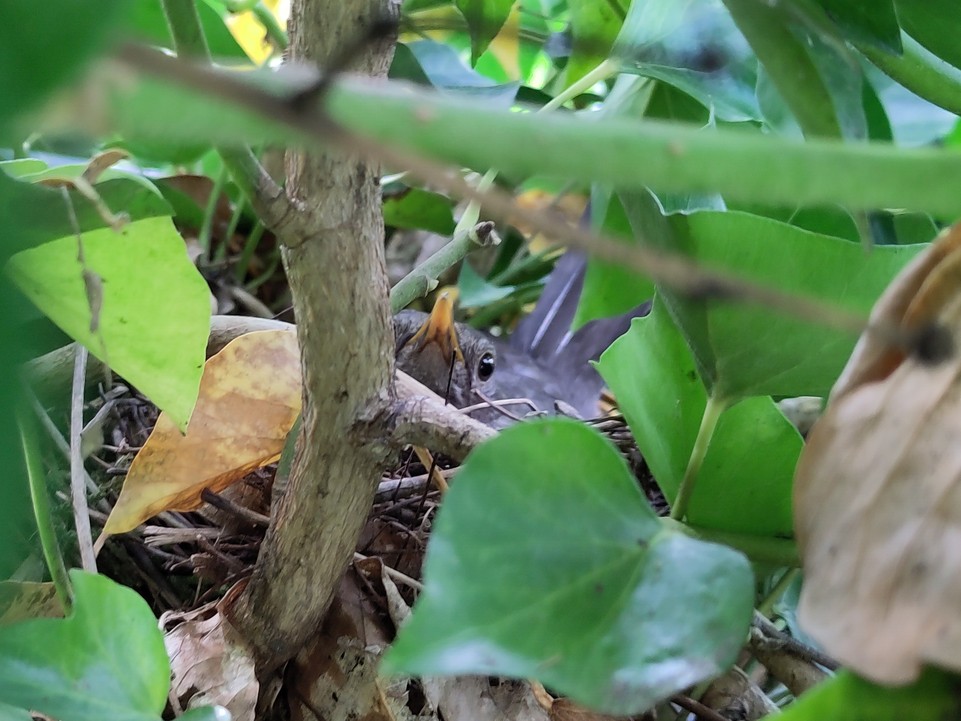 An einer anderen Stelle, zehn Meter von den anderen Nestern entfernt, haben Amseln vor zwei Wochen ein Nest im Efeu gebaut. Sie haben - es ist schon Tradition - fünf Eier gelegt, von denen drei dieses Wochenende geschlüpft sind.